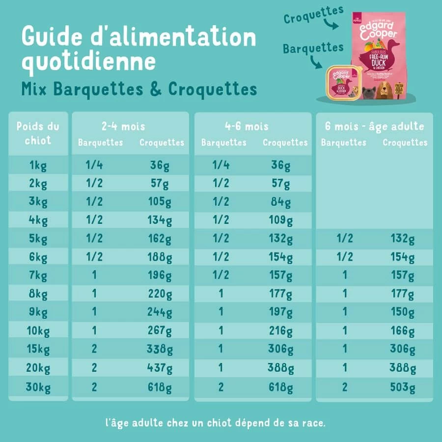 Cette recette est parfaite pour les chiots plein d’énergie. Avec une combinaison irrésistible de poulet et de canard frais, votre chiot l’engloutira en un rien de temps. Bien sûr, comme c’est une recette Edgard & Cooper, elle est aussi très bonne pour eux : la viande de canard et de poulet les aide à développer leurs muscles et à renforcer leur système immunitaire. Et comme cette recette est sans céréales, elle est particulièrement bonne pour les chiots au ventre sensible. Convient aux chiots stérilisés ou actifs de toutes races.