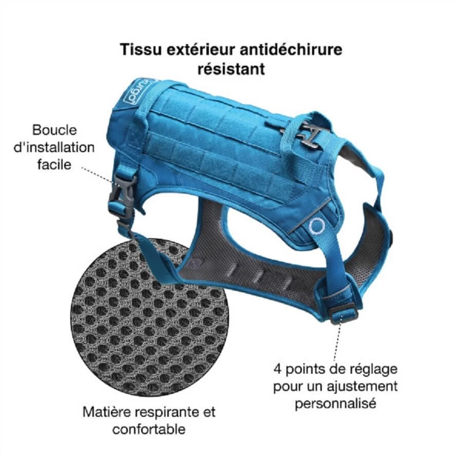 Avec ses deux empiècements rembourrés au niveau du dos et du poitrail, il répartit uniformément le poids du chien, réduit la pression et supportera tout ce que votre chien lui fera subir grâce à son matériau 400D anti-déchirure durable.